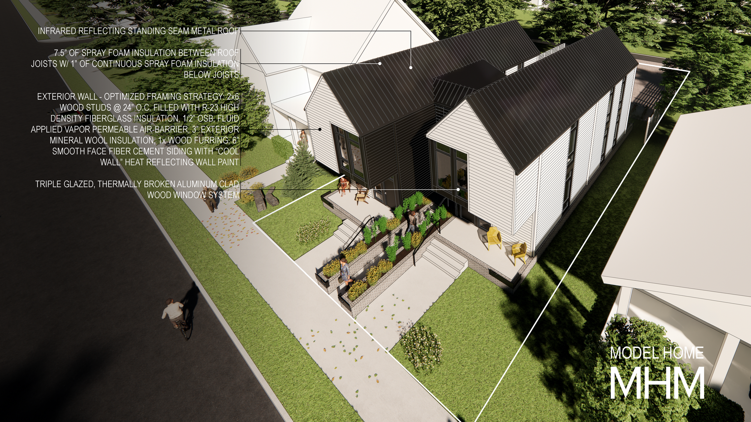 Affordability and sustainability are treated as inseparable aims. The project targets Passive House Institute US (PHIUS) design certification, employing operational and embodied carbon modeling to reduce energy demand, improve comfort and durability, and stabilize long-term costs for residents. By deploying standardized assemblies and common building techniques, the design supports both feasibility and scalability across multiple infill parcels.